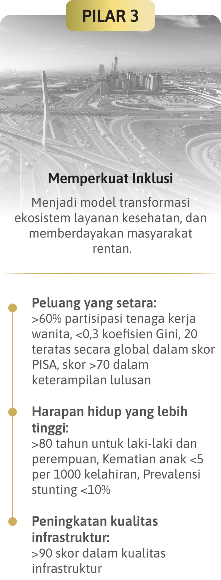 Seluruh pilar-pilar dalam Peta Jalan Indonesia Emas 2045 dapat terimplementasikan dan terwujud dengan ketersediaan SDM yang unggul dan kompeten sebagai enablers.
